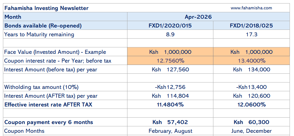 Central Bank of Kenya has reopened 2 fixed-coupon (FXD) Treasury Bonds in the April 2026 auction. Both are taxable bonds (not tax exempt IFBs-Infrastructure bonds). They offer stable semi-annual income for investors.